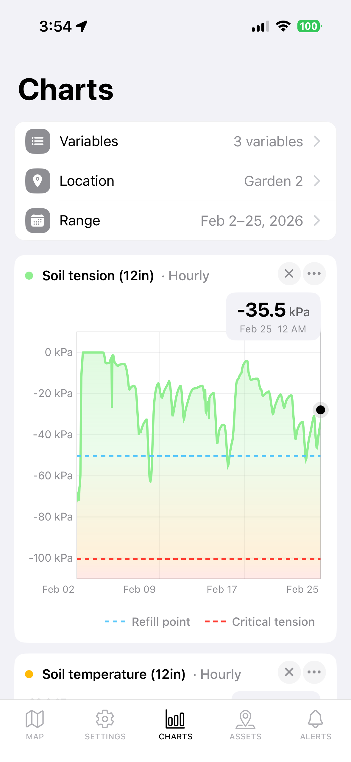 Track soil tension against refill and critical thresholds so you can time irrigation based on real field conditions, not a schedule.